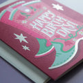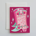 A hand-painted birthday boot in shades of magenta, pink, and aqua is punctuated with shiny silver foil to send the most Yeehaw! greetings to the birthday girl!