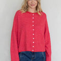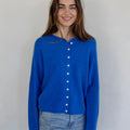Soft and cozy lightweight cardigan with rolled edge finish on the sleeves and collar.