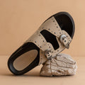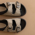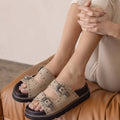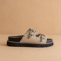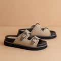 Western flair in an easy-to-wear slide. Featuring bold double buckle hardware and a comfortable slip-on design, this style blends laid-back ease with modern Western-inspired details. Crafted with atelier-selected materials for everyday versatility. Materials: * Upper Material: Vegan leather upper * Insole Material: Synthetic Insole * Sole or Heel Material: Rubber outsole Details: * Brand: Oasis Society * Shaft Height: * Heel Height: 0.75" * Types of Closures: slip on * Size Run: S