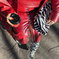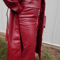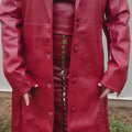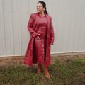 This best-selling silhouette is back by popular demand! This high-waisted midi skirt features a form-fitting silhouette that flatters every figure. Crafted from buttery vegan leather, it offers a luxurious feel without compromising on ethics. The full placket of silver metal snaps and the deep red spices up the look making it versatile piece for both day and night wear.