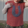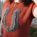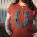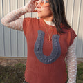 The Umami Knit Vest Serve up cozy style with this ribbed sweater vest featuring a bold horseshoe applique at the front. Designed with a round neckline and relaxed drop shoulders, it offers an easy, laid-back fit. The sleeveless silhouette makes it perfect for layering or wearing solo for an effortlessly cool look.